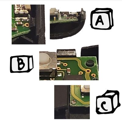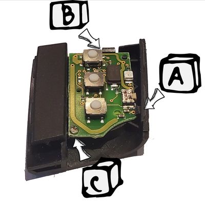When installing your old electronics board, there are three areas in the shell that MUST be installed properly. The board MUST be seated under (or over) these points (A, B, and C) or the buttons will not work correctly (and will constantly be depressed & the red LED will flash continuously). When closing the remote if the red LED is flashing continuously try pressing the buttons. This may fix your issue and if so, the conversion is be complete. If this does not fix the continuous flashing light, the shell must be reopened and the board adjusted so that points A, B, and C are aligned properly.